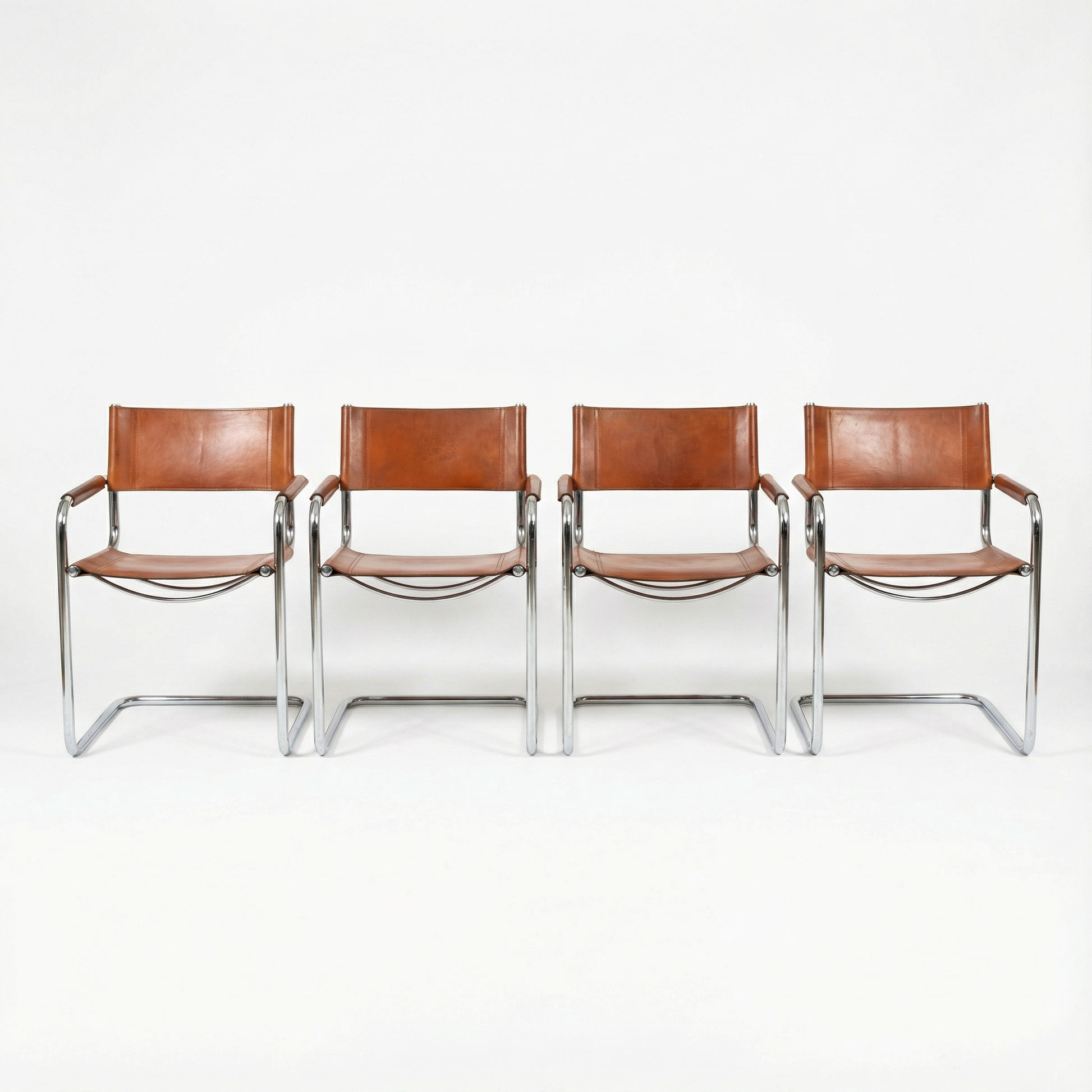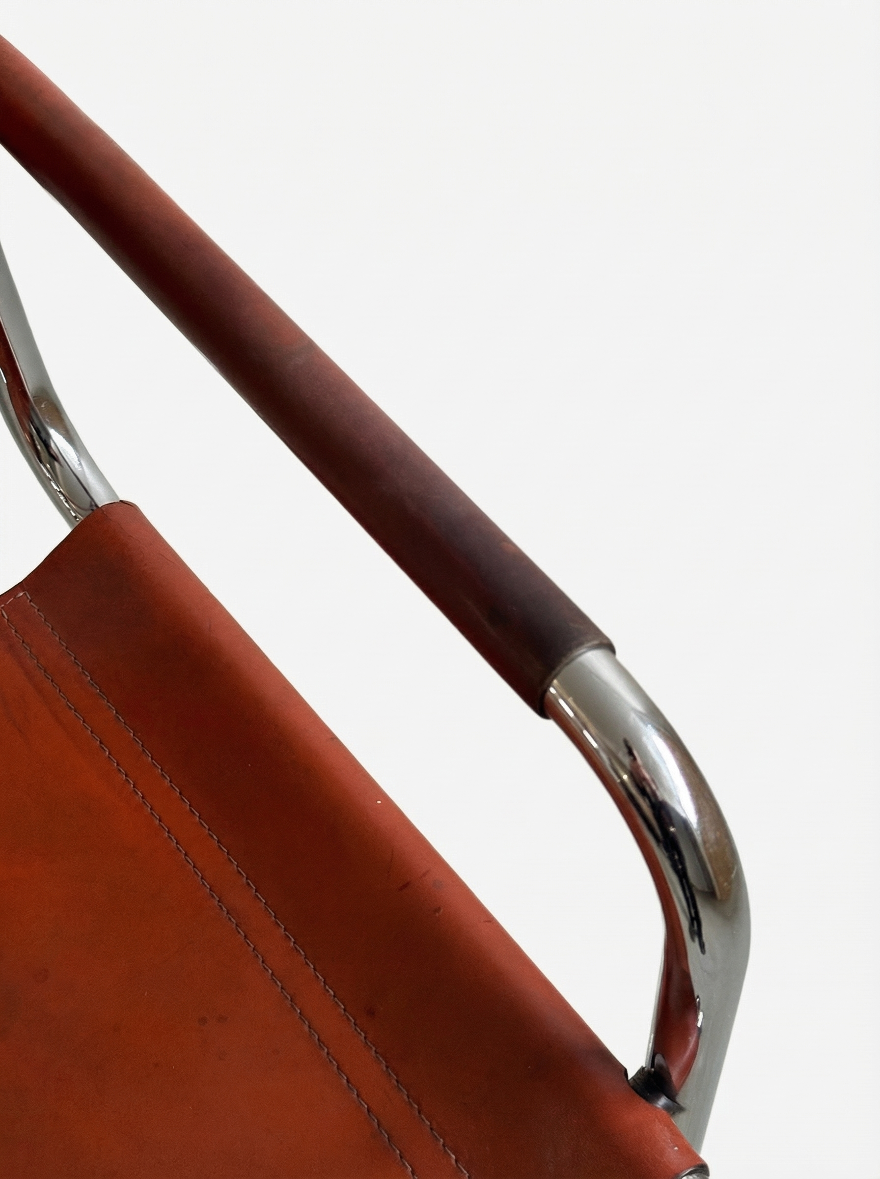 The chair features a chrome-plated tubular steel frame paired with thick saddle-stitched cognac leather for both seat and backrest. The leather has developed a warm patina and minor signs of age — exactly what you would expect from an authentic vintage piece, adding depth and character without compromising structural integrity.