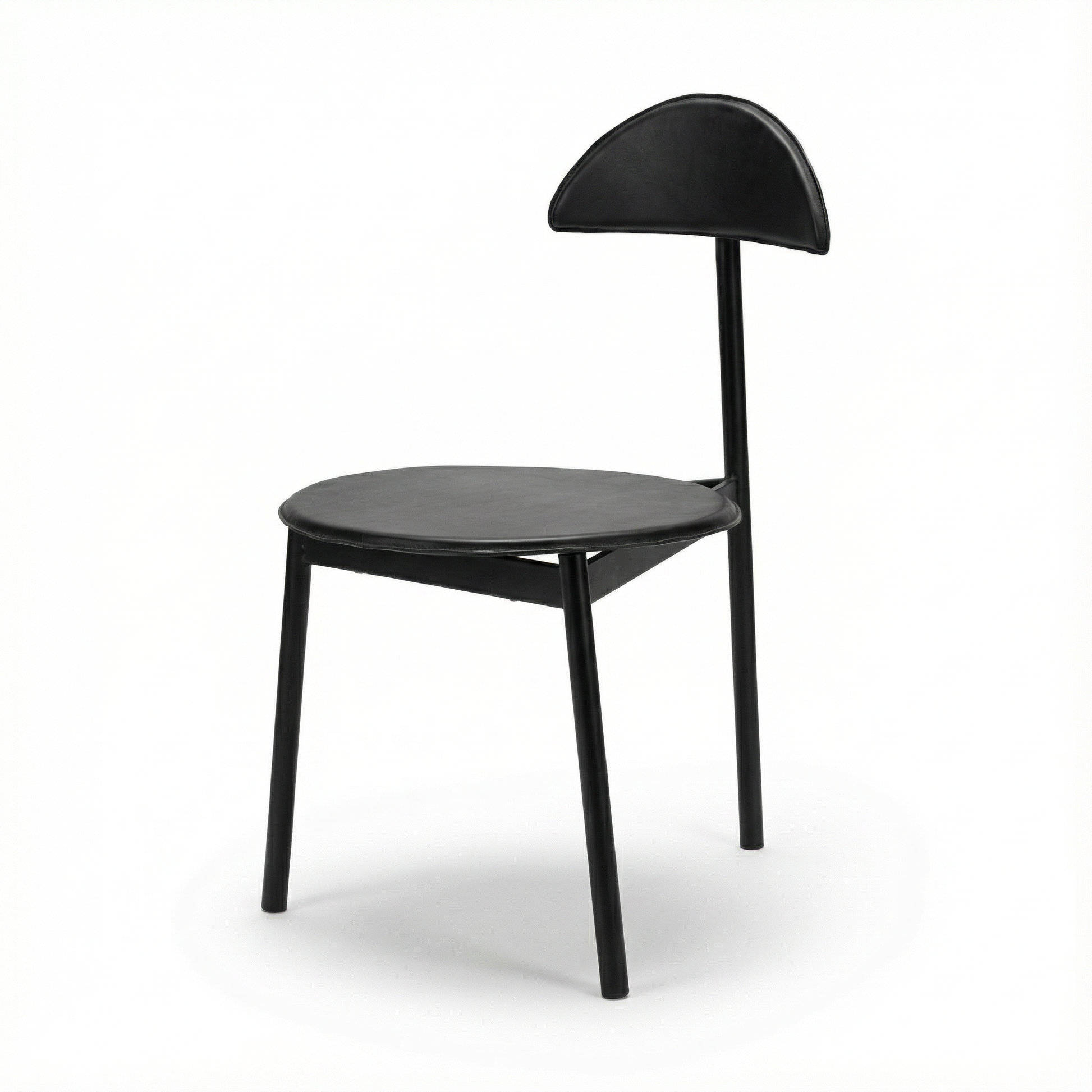 Refined and elegant set of three dining chairs, originally produced by the Italian company Linea Veam in the 1980s. Each chair features a sculptural tripod metal base finished in black lacquer, paired with a minimalist seat and curved backrest.