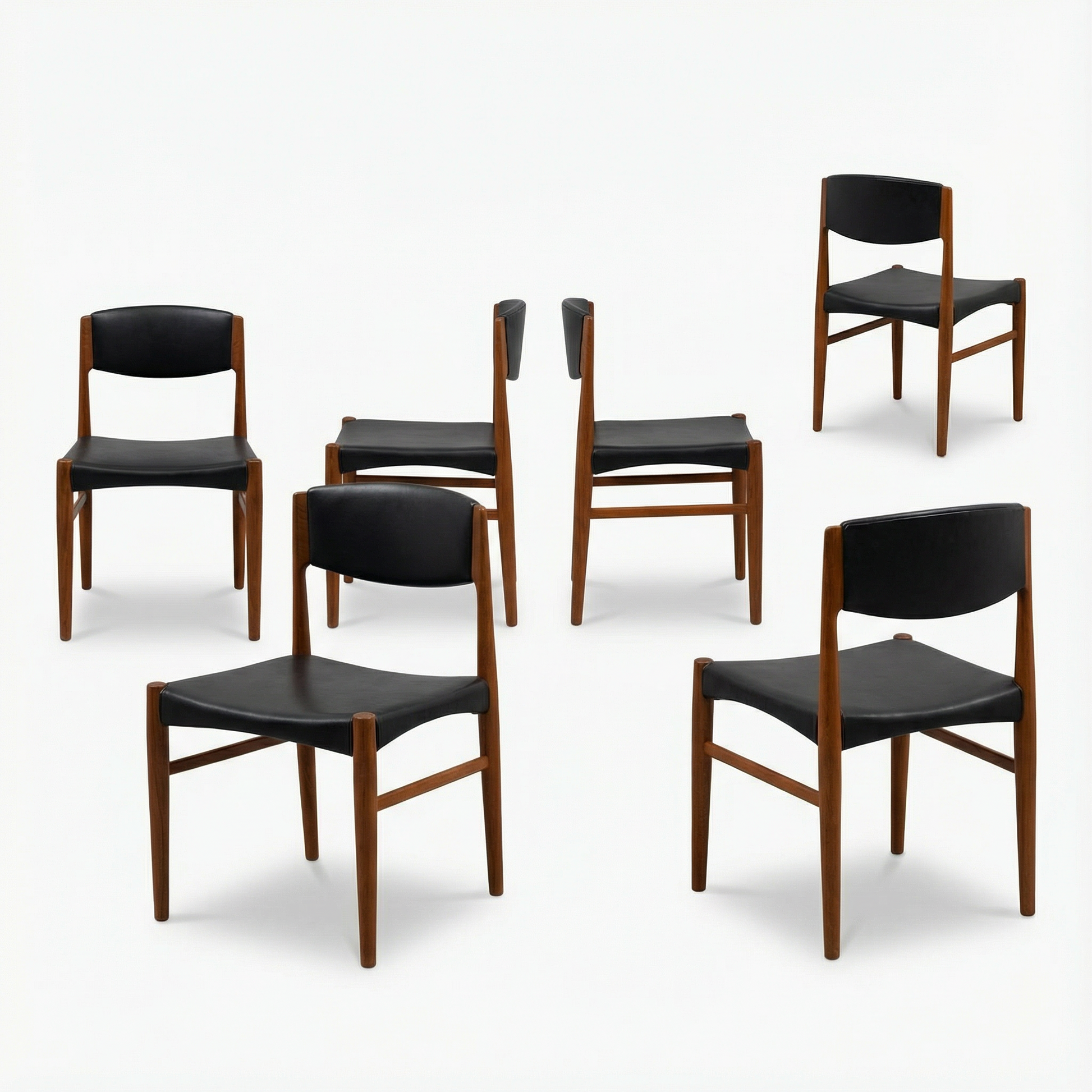 All six chairs have been reupholstered in new high-quality black leather, offering a clean, timeless contrast to the teak and enhancing everyday comfort. Some light wear consistent with age remains on the wooden frames, maintaining the vintage character without compromising functionality.
